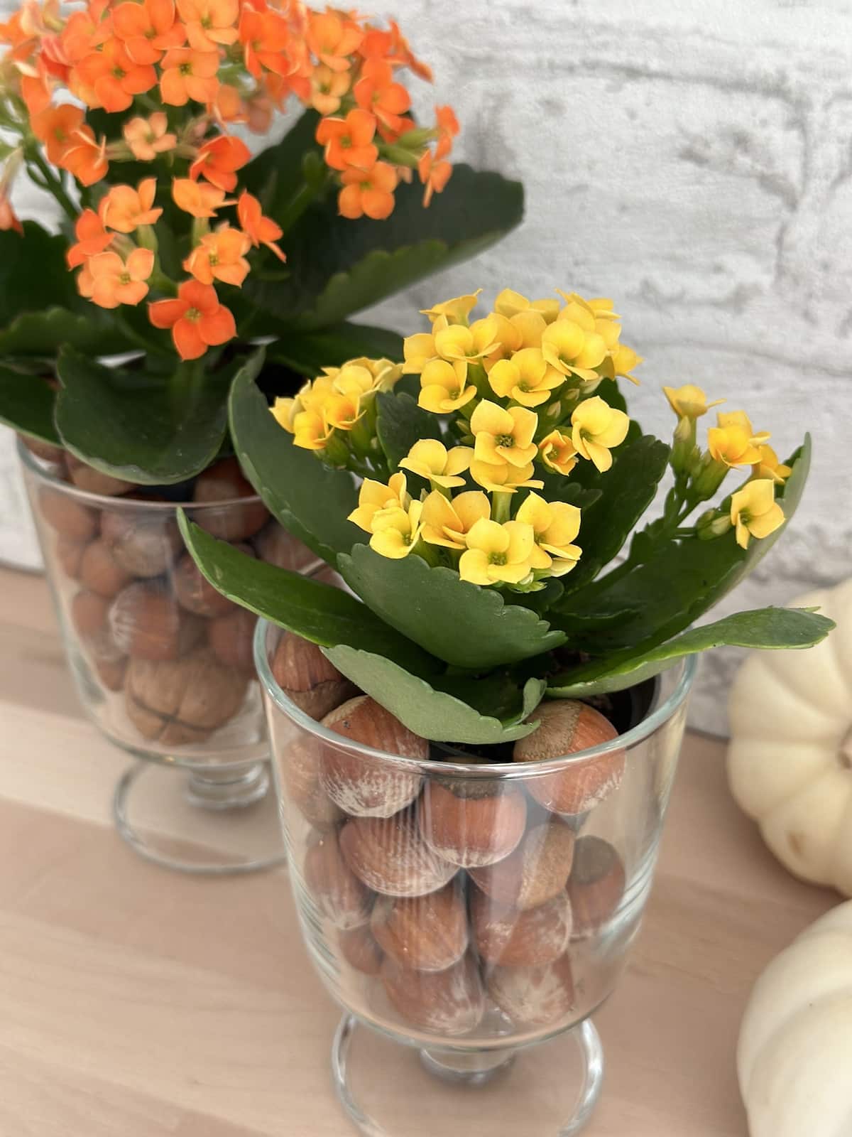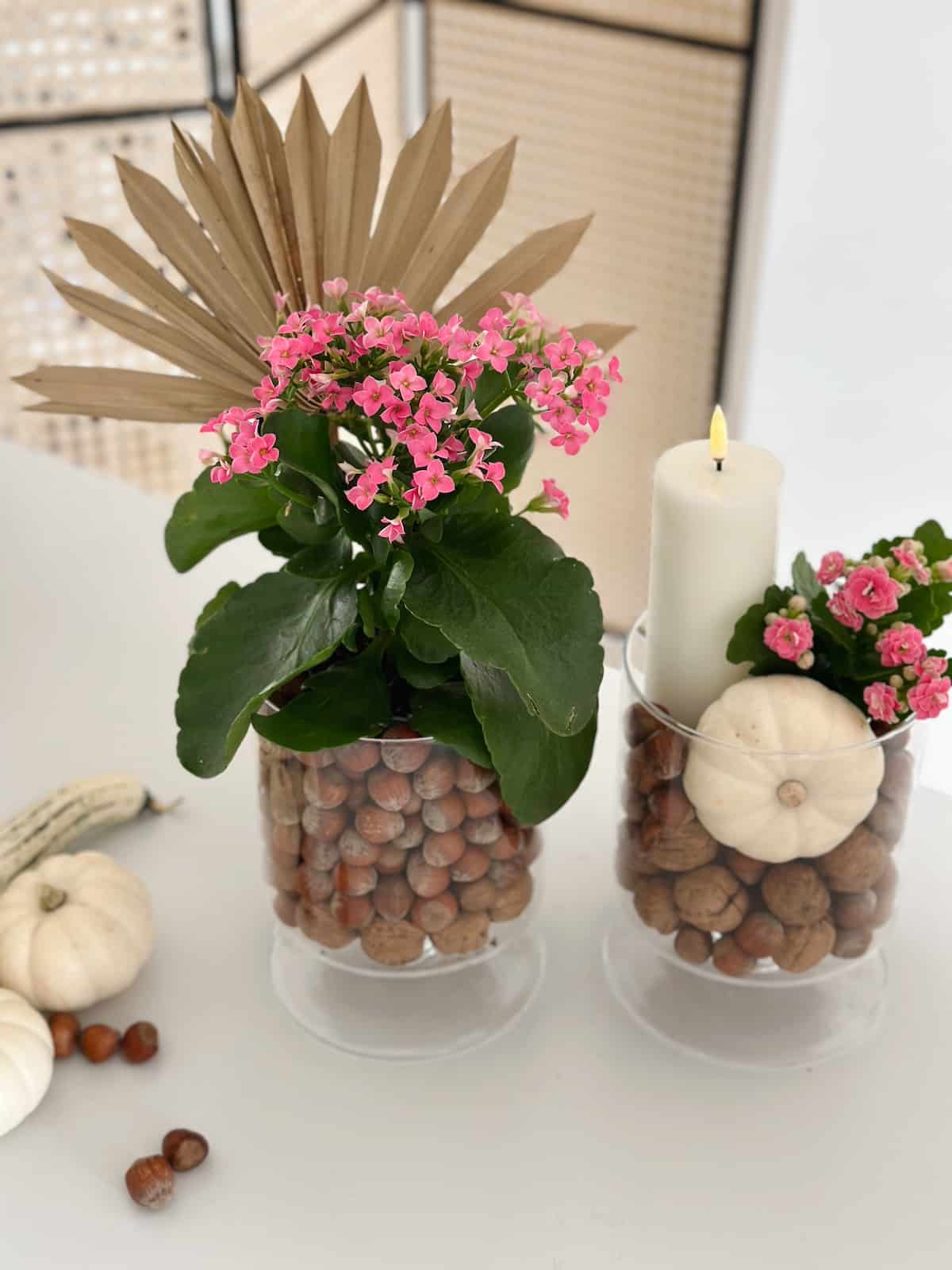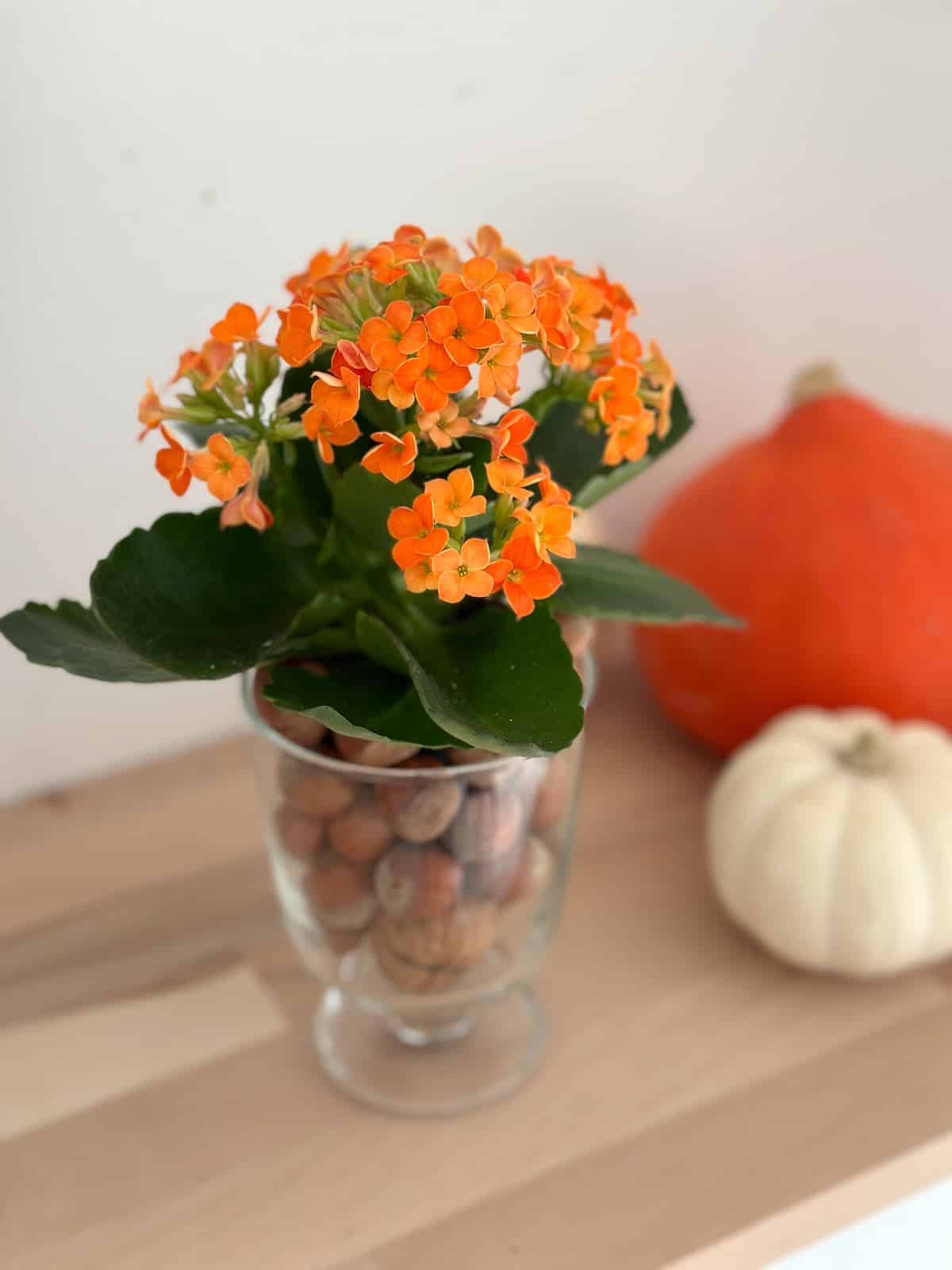 Die Kalanchoë lässt sich so toll mit herbstlichen Deko Elementen, wie Kürbisse und Nüsse dekorieren. Ich bin total begeistert, wie hübsch diese herbstliche blumige Deko geworden ist.