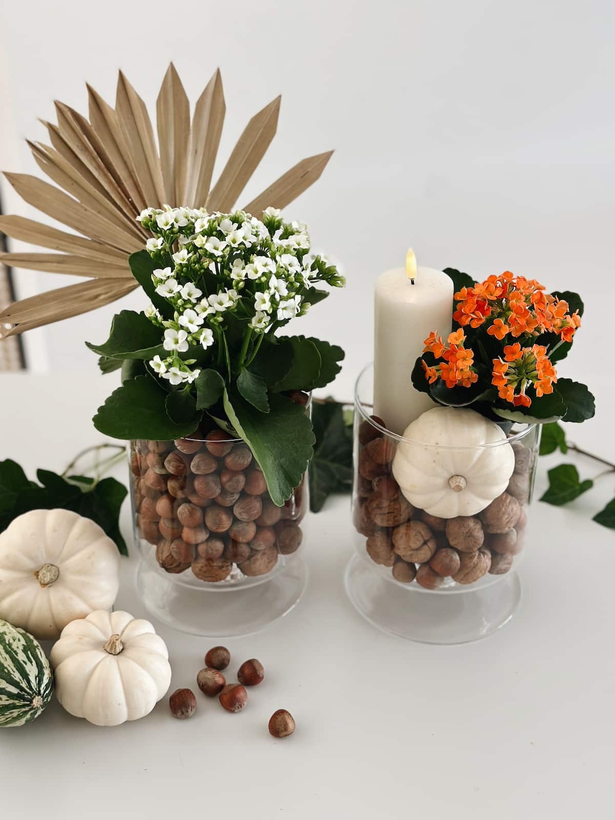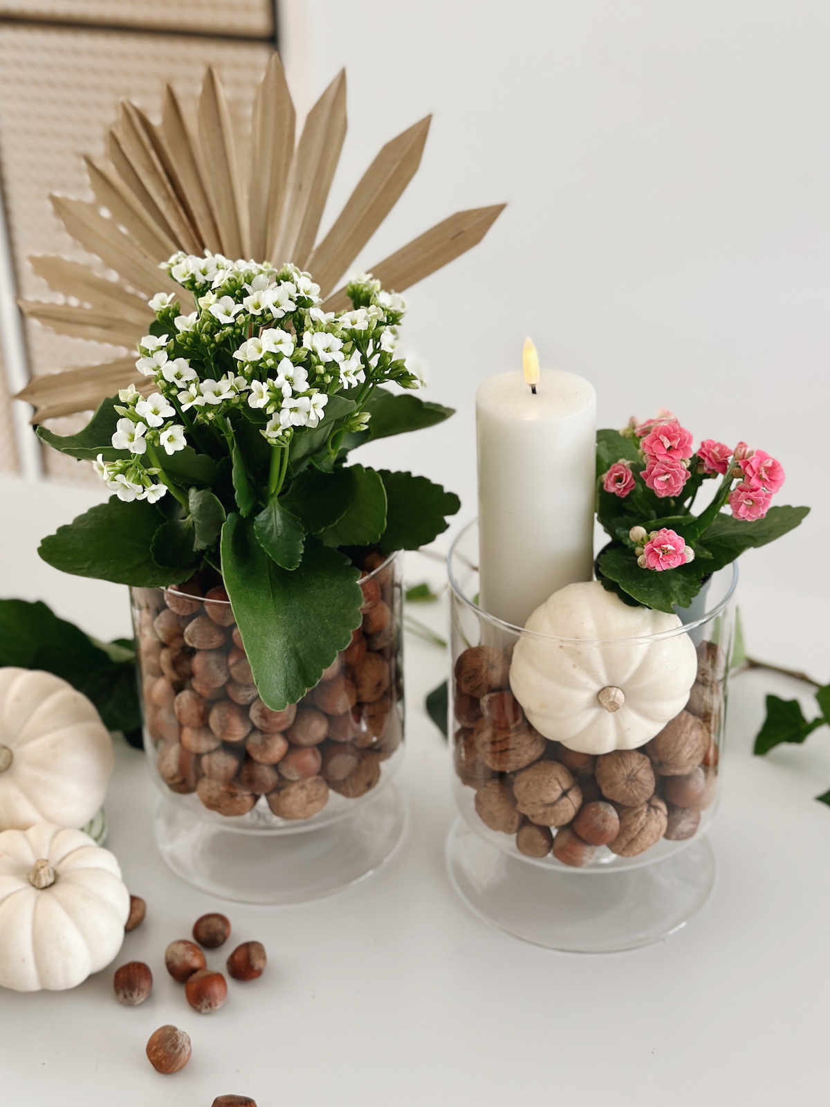Die zweite Vase füllt ihr zur Hälfte mit den Nüssen und stellt anschließen die Kerze seitlich hinein , sowie einen kleinen Kürbis und die Mini Kalanchoë. Die Lücken füllt ihr zum Schluss noch mit Haselnüssen auf. Fertig!